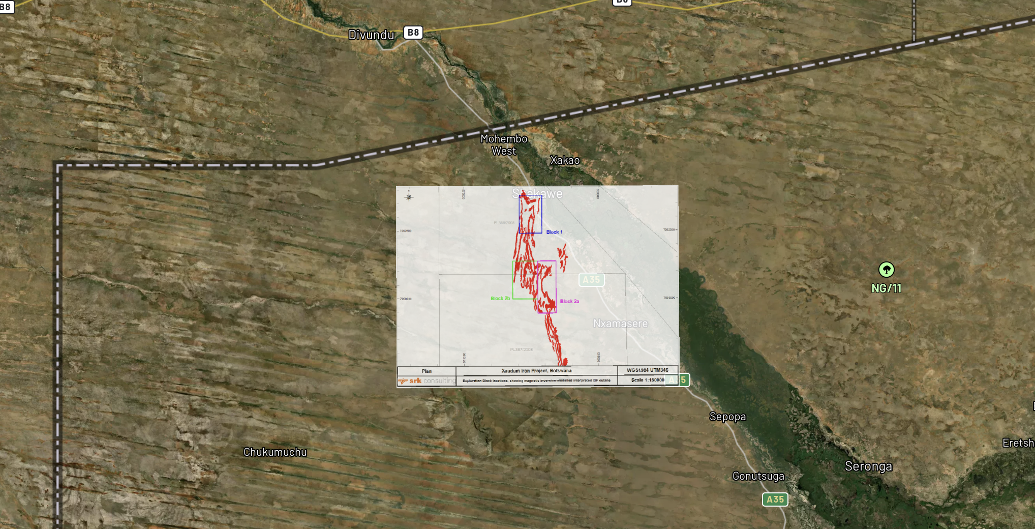Exploration blocks and geological contacts extracted and georeferenced over satellite imagery
